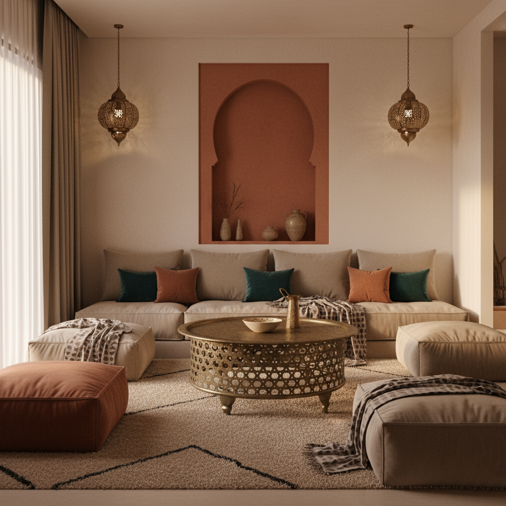 | Les Couleurs Chaudes | Les teintes vives sont remplacées par des palettes de couleurs terreuses (terracotta, safran, argile) qui rappellent les paysages marocains, associées à des matériaux bruts comme le béton ciré et le bois foncé. | Crée une atmosphère chaleureuse, apaisante et profondément ancrée dans le terroir. |