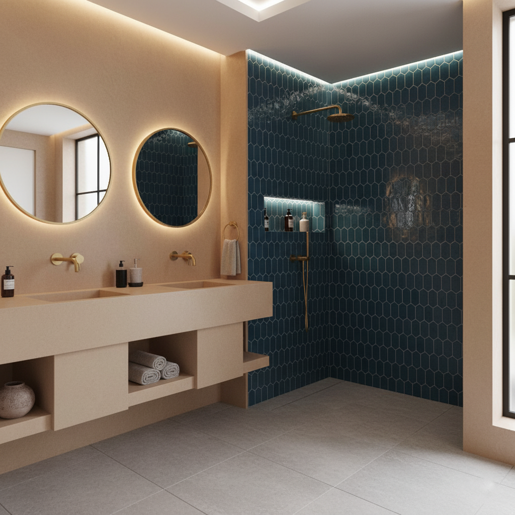 | Le Zellige et le Tadelakt | Utilisés non plus en surcharge, mais comme des touches d’accent sur des murs ou des bassins. Le Tadelakt se décline en teintes neutres (sable, ocre clair) pour une texture subtile et organique. | Confère une richesse tactile et une authenticité artisanale sans alourdir le design. |